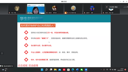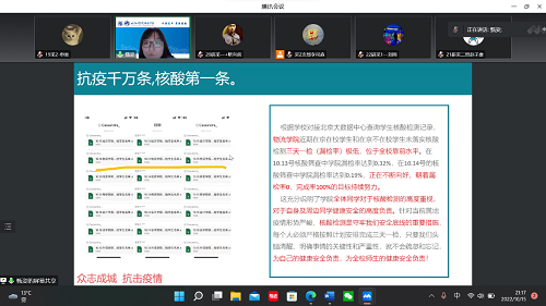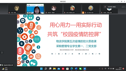 最后,采购管理专业学生第一、二党支部向同学们介绍了关于学生如何做好自身防控方面的注意事项,并强调希望大家能够在特殊的时期理解和配合,认识到校园疫情防控从严从紧的特殊性和重要性。努力克服由于疫情带来的学习、生活上的困难,杜绝厌倦情绪和懈怠心理,充分发挥学生自我教育、自我管理、自我服务作用,保证线上于线下相结合教学的高质量完成,呼吁大家坚持健康打卡、三天一检核酸并按期接种疫苗。