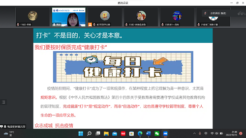 其次,采购管理专业学生第一、二党支部强调每日健康打卡在目前的防疫工作中的重要性,表明每日健康打卡的目的是有助于学校在目前严峻的疫情形势下,更全面的掌握同学们的健康状况并及时予以帮助,全体同学需按要求按时完成每日健康打卡,做好自身防护,为自己负责,同时也为家人、同学和老师起到及时的预警作用。