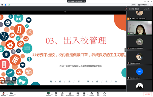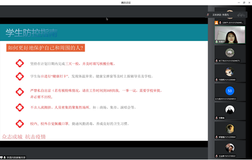 最后,李清月老师给全体同学提供了疫情防控指南。提出我们要严格落实学校各项防疫相关政策,有问题及时和辅导员老师进行沟通上报,同时严格落实非必要不出校政策,不去人流拥挤、人员密集的聚集性场所,在校内校外自觉佩戴口罩。