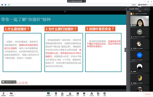 随后,李清月老师强调了加强针接种的重要性。李老师提出,接种加强针以后,受种者的抗体水平将大幅提升,并且对德尔塔等变异株出现良好交叉中和作用。作为在校大学生,我们更应做到应接尽接,共筑校园疫情免疫屏障,共同履行疫情防控的社会责任。