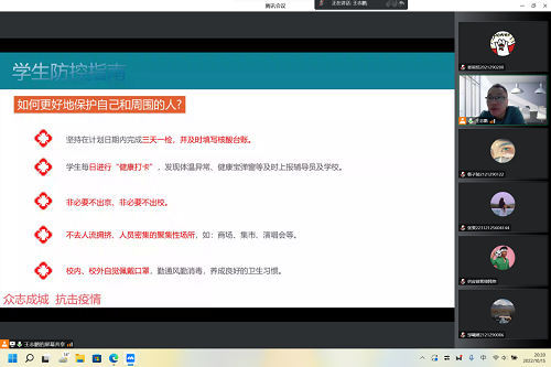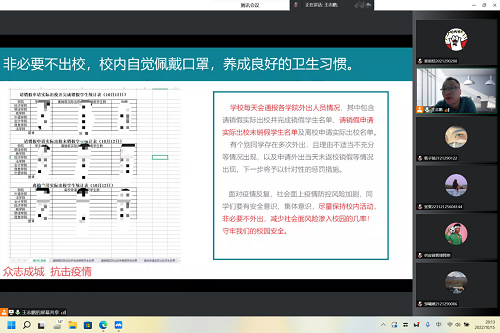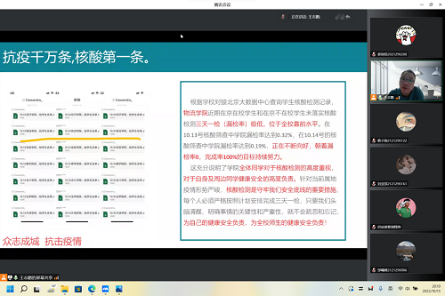 供应链管理专业学生第一党支部通过腾讯会议的形式,开展主题为“用心用力——用实际行动共筑‘校园疫情防控屏’”的第五次疫情防控“大思政课”宣传教育活动,党支部纵向管理下的各个本科生班级、研究生班组全体学生参加了本次宣传教育活动。