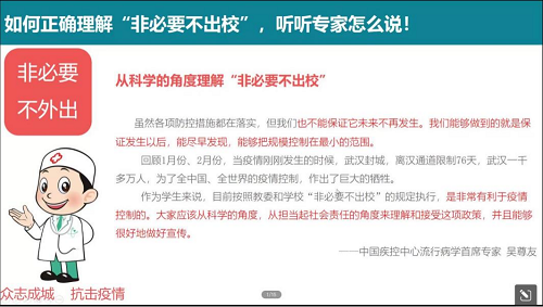 接着刘晨老师从科学的角度为我们解读了“非必要不出校”原则:“非必要不出校”规定非常有利于疫情控制,我们应主动的承担起责任,主动维护当前来之不易的大好局面,在自律的基础上,把“非必要不出校”变成一种自觉。