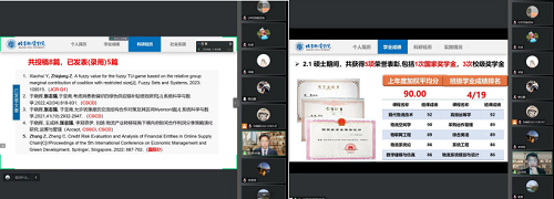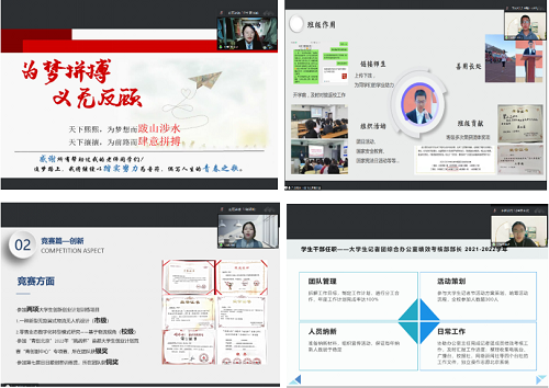 答辩过程中,研究生同学分别从学习成绩、科研竞赛获奖情况(科研获奖、科研成果转化、智库类成果、学术著作成果、标准成果、学术论文成果)、学生干部履职尽责情况、学科竞赛获奖情况、学院/学校贡献、社会实践情况、社会公益及志愿活动情况等方面进行了汇报。本科生同学分别从课程加权成绩、竞赛奖项和科研情况、学生干部履职尽责情况、学院/学校贡献、社会实践情况、社会公益及志愿活动情况等方面进行了汇报。