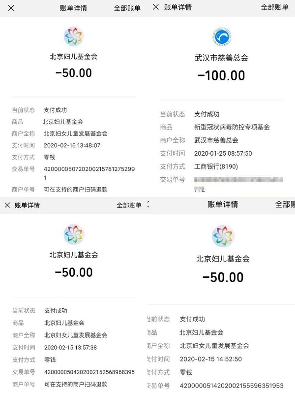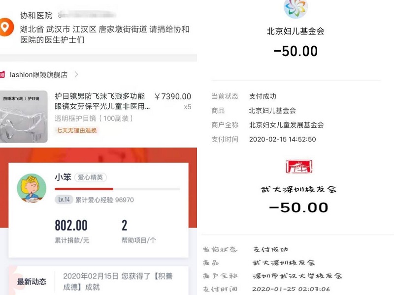 截止2020年2月16日,我院全体学生捐赠价值共计约72813元。其中,学生党支部各党员捐款捐物,价值共计40347.58元,其中向北京妇女儿童基金会捐款1475元;全体研究生捐款捐物,价值共计16224.8元,其中以班级为单位向北京妇女儿童基金会捐款7442.8元;全体本科生捐款捐物,价值共计16240.63元,其中以团支部为单位向北京妇女儿童基金会捐款12466.14元。