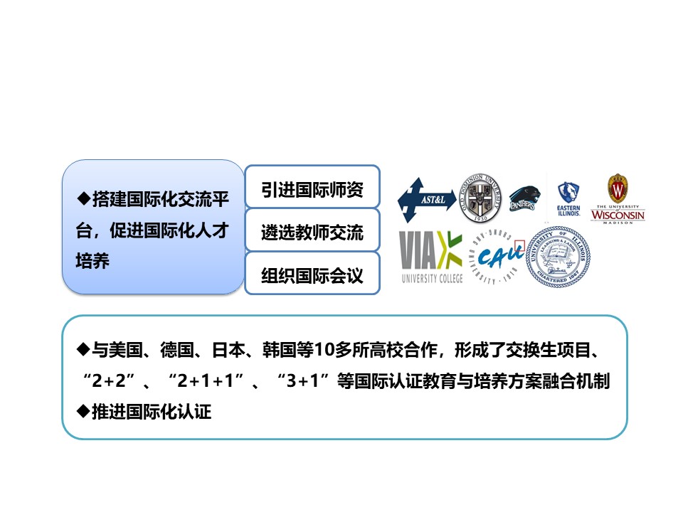 建立国际共融人才机制,实现国际化人才培养。构建了“2+2”中美国际班、“2+1+1”日通国际班、“3+1”中德国际班机制,实现国际化人才培养。其中,中美班运行6年,培养学生190人;日通班运行2年,培养学生30人;中德班已运行15年,培养学生200人交换1年学习,互派教授讲学782课时;中长期国际交流学生覆盖率达到30%,取得了显著效果。