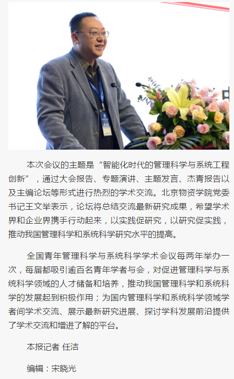 本次会议的主题是“智能化时代的管理科学与系统工程创新”,通过大会报告、专题演讲、主题发言、杰青报告以及主编论坛等形式进行热烈的学术交流。北京物资学院党委书记王文举表示,论坛将总结交流最新研究成果,希望学术界和企业界携手行动起来,以实践促研究,以研究促实践,推动我国管理科学和系统科学研究水平的提高。