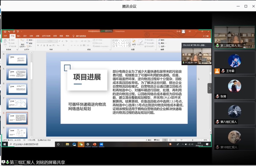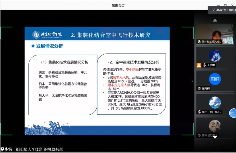 立项的70项大创项目,研究内容涉及了物流包装保鲜方式的优化与创新、全自动化系统、电商和校园服务需求分析等方面,选题新颖、范围广泛、贴近生活和生产实际。尽管是在线上进行展示和交流,但各位专家和汇报同学们均热情高涨,在各组队伍展示完成后,专家们准确犀利地指出项目研究所存在的问题,并逐点深入剖析,给予每组改进措施及点明后续研究方向,使同学们受益匪浅。