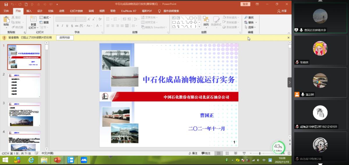 2020年11月19日晚18:10,物流管理专业“物流名家讲座”课程第十讲开讲。本次邀请到中国石化股份有限公司北京石油分公司物流中心副经理曹国正老师,讲座主题为《中石化成品油物流运行实务》,由物流管理专业温卫娟老师主持,物流管理本科生及部分十大网络真人娱乐场排名