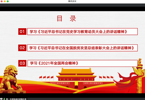 九个学生党支部于2021年3月开展学史悟思系列专题党课第一讲。此次党课由学生党支部书记老师主讲,各个支部党员、预备党员全员参与,带领学生主要对《习近平总书记在党史学习教育动员大会上的讲话精神》、《习近平总书记在全国脱贫攻坚总结表彰大会上的讲话精神》以及《2021年全国两会精神》三个方面进行学习。