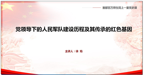 国防大学教师、少将、军事史专家徐焰教授应邀担任主讲嘉宾,聚焦“党领导下的人民军队建设历程及其传承的红色基因”为首都师生上了第三堂党史课。徐焰教授以风趣幽默的语言,首先对当前的国际形势进行分析。其次,聚焦于农民问题,提出农民问题的核心是土地问题,土地革命、武装斗争和共产党的领导是中国革命战争的主要内容。徐焰少将通过丰富的史料和详实的数据,全面回顾了我们党的百年奋斗历程,同时也科学解答了“中国共产党的初心和使命”这一重大课题。