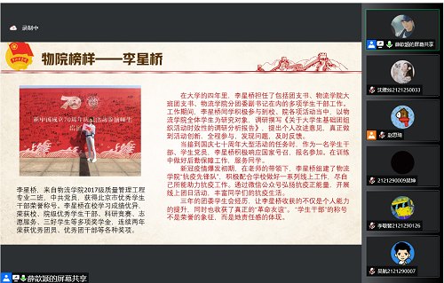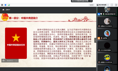 首先,薛歆颖同学通过中国共青团简介,主讲了共青团的使命和性质、中国共产主义青年团有着光荣的历史和中国共青团基本任务,提醒各位同学牢记中国共青团是党的助手和后备军,是党开展青年工作的重要力量的理论知识,找到自己今后进步和努力的方向,未来将刻苦学习,不负光阴,绽放青春正能量!