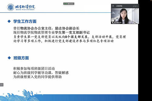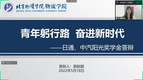 在答辩开始前,李清月老师详细介绍了“日通奖学金”和“中汽阳光奖学金”的名额和评审标准,并对测算细则文件进行了解读。在随后的答辩过程中,同学们从个人状况、思想道德、学习成绩、实践活动、科研竞赛等方面进行了全方位的汇报,从不同的角度对自己进入大学的学习生活进行了总结,阐述了自己的成绩与优势,将自己积极上进、努力进取的精神展现的淋漓尽致。拥有各种荣誉的他们,在光荣的背后,更多的是不忘初心、咬紧牙关、满怀热忱的坚持。同时,参评同学们也表示了对党的忠诚信仰,对为同学、为人民服务的衷心热忱,让评委们充分感受到了新时代大学生的蓬勃朝气。