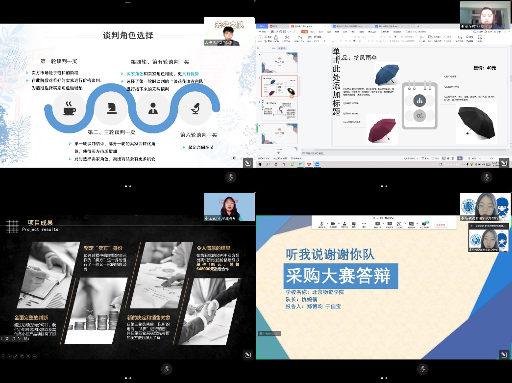 2022年5月18日,16支队伍依次进入会议室,向评委老师汇报总结决赛的谈判过程。汇报中,各小组都能够在谈判、复盘过程中修改谈判策略,并不断提高自己团队的应变能力;同时,在谈判中,无论是在基本条件方面还是在辅助条件方面,双方都会进行适当地让步,充分体现了采购管理专业“求索价值,交换竞力”的理念。